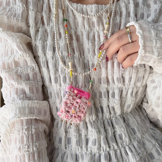 ちくわ手芸店さんとの初コラボから生まれた、 一点もののネックレス 【Pocket Candy】 小さな“あめちゃん入れ”をイメージした、 手編みのミニポケットが主役のデザインです。 やわらかな糸で丁寧に編まれたポケットを、mamoらしいカラフルなビーズとコードでつなぎ、 首元に遊び心を添えるアクセサリーに仕上げました。 コードで長さ調整も可能となっており、ゆったりした長さに仕上げているので頭から被って首に掛けて頂ける位長くお作りしています♪ そして、表と裏で糸の種類が異なる点もお勧めポイント!(こちらは写真9.10枚目が裏面です) 気分に合わせてお好きな色を表で着用してください。 「可愛さを持ち歩く」 そんな気持ちから生まれたこのアイテムは、 見るたび、身につけるたびに気分が少し明るくなる存在。カジュアルな装いに合わせると、コーディネートの中でやさしく個性が光ります。 そして、デザインはすべて一点ものでご用意しています。 手仕事ならではの表情や色の重なりを楽しみながら、あなただけの“持ち歩ける可愛さ”を着けてみませんか♡ ※本作品は ちくわ手芸店 とのコラボレーションアイテムです。 size 最短 68㎝ 最長 約90㎝