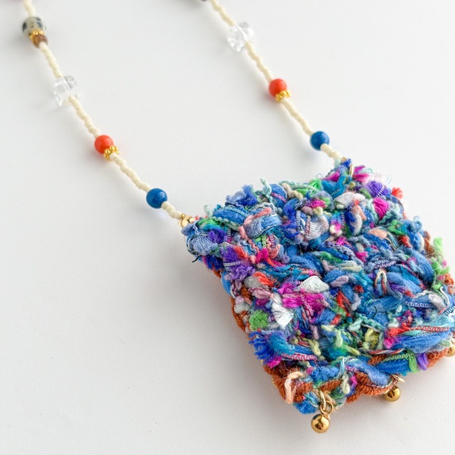 ちくわ手芸店さんとの初コラボから生まれた、 一点もののネックレス 【Pocket Candy】 小さな“あめちゃん入れ”をイメージした、 手編みのミニポケットが主役のデザインです。 やわらかな糸で丁寧に編まれたポケットを、mamoらしいカラフルなビーズとコードでつなぎ、 首元に遊び心を添えるアクセサリーに仕上げました。 コードで長さ調整も可能となっており、ゆったりした長さに仕上げているので頭から被って首に掛けて頂ける位長くお作りしています♪ 「可愛さを持ち歩く」 そんな気持ちから生まれたこのアイテムは、 見るたび、身につけるたびに気分が少し明るくなる存在。カジュアルな装いに合わせると、コーディネートの中でやさしく個性が光ります。 そして、デザインはすべて一点ものでご用意しています。 手仕事ならではの表情や色の重なりを楽しみながら、あなただけの“持ち歩ける可愛さ”を着けてみませんか♡ ※本作品は ちくわ手芸店 とのコラボレーションアイテムです。 size 最短 68㎝ 最長 約90㎝