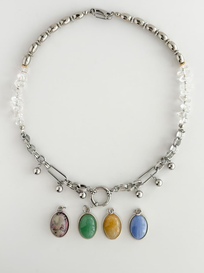 シルバーチェーンにクリスタルの天然石を組み合わせ、取り外し可能な天然石チャームを組み合わせたデザインです♡