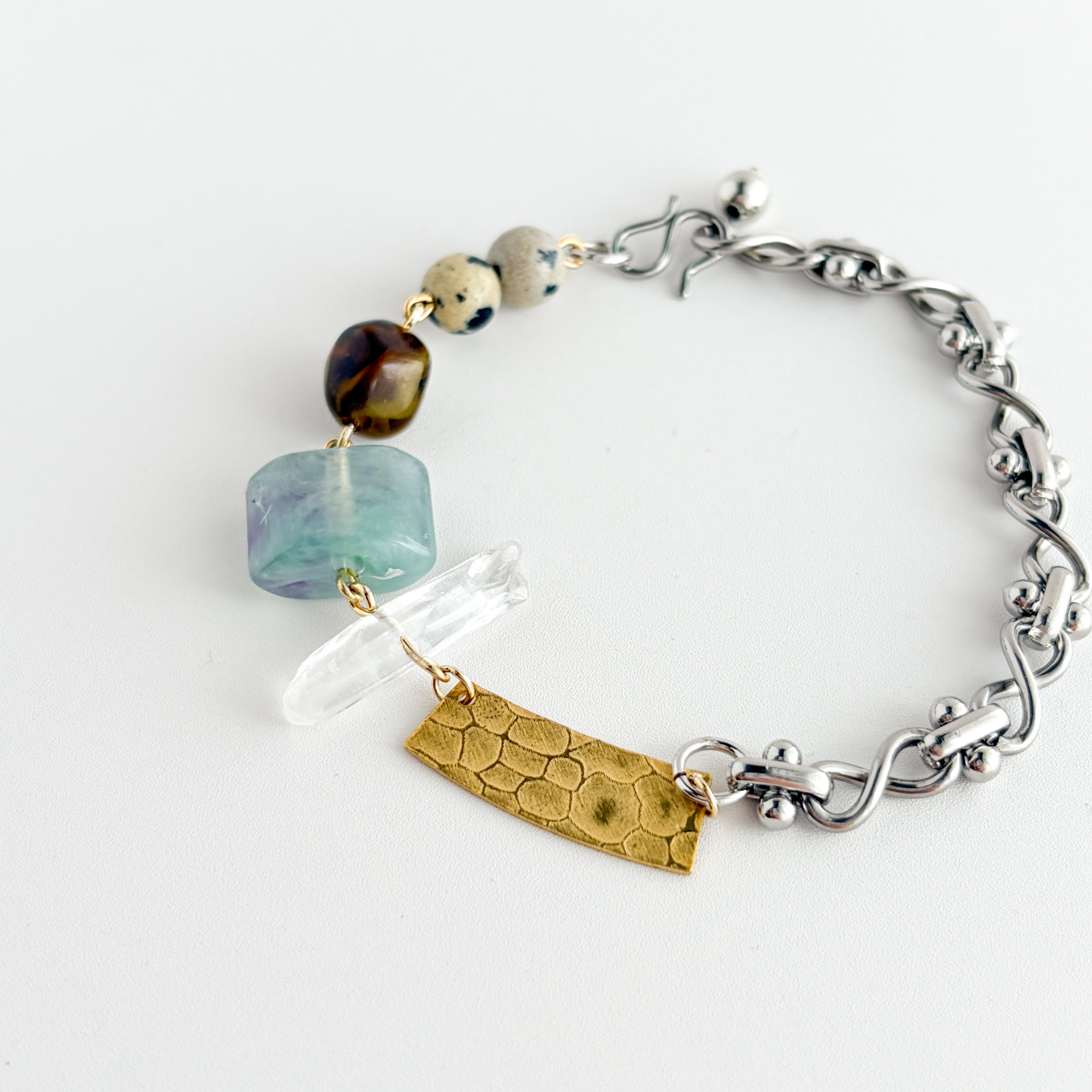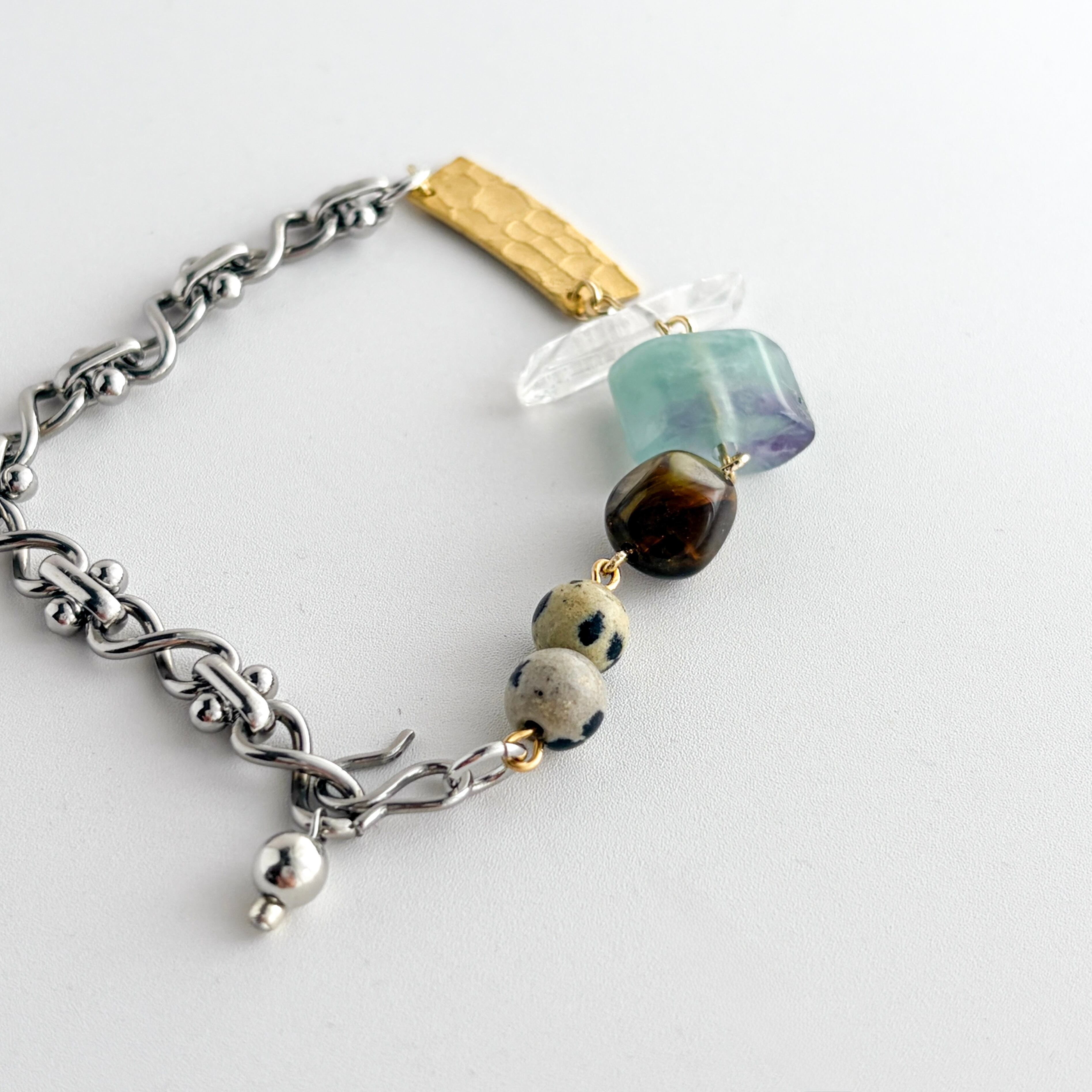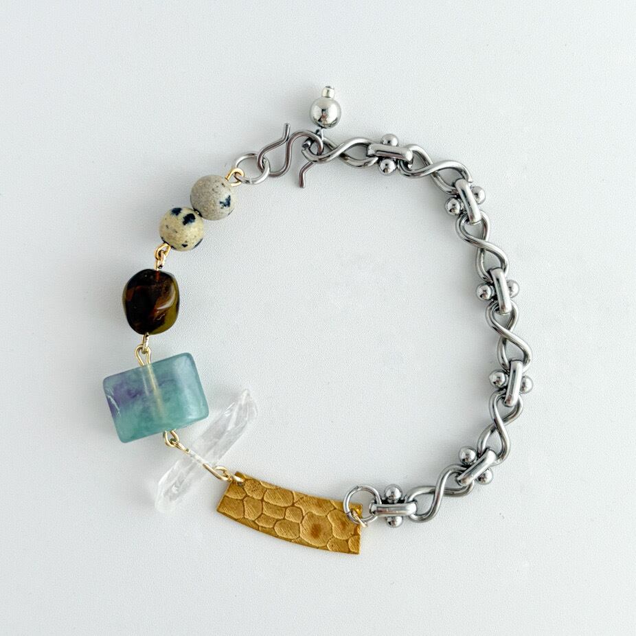 デザイン性のあるシルバーチェーンと、立体的な拘りパーツが絶妙に組み合わさったブレスレット。