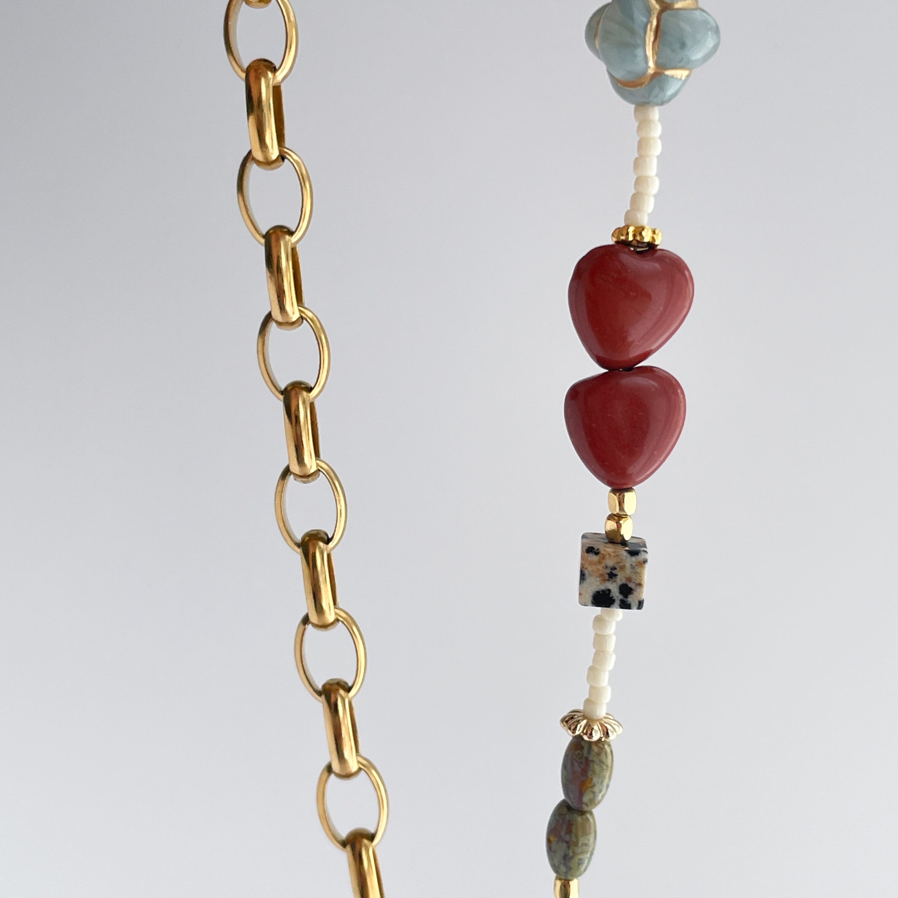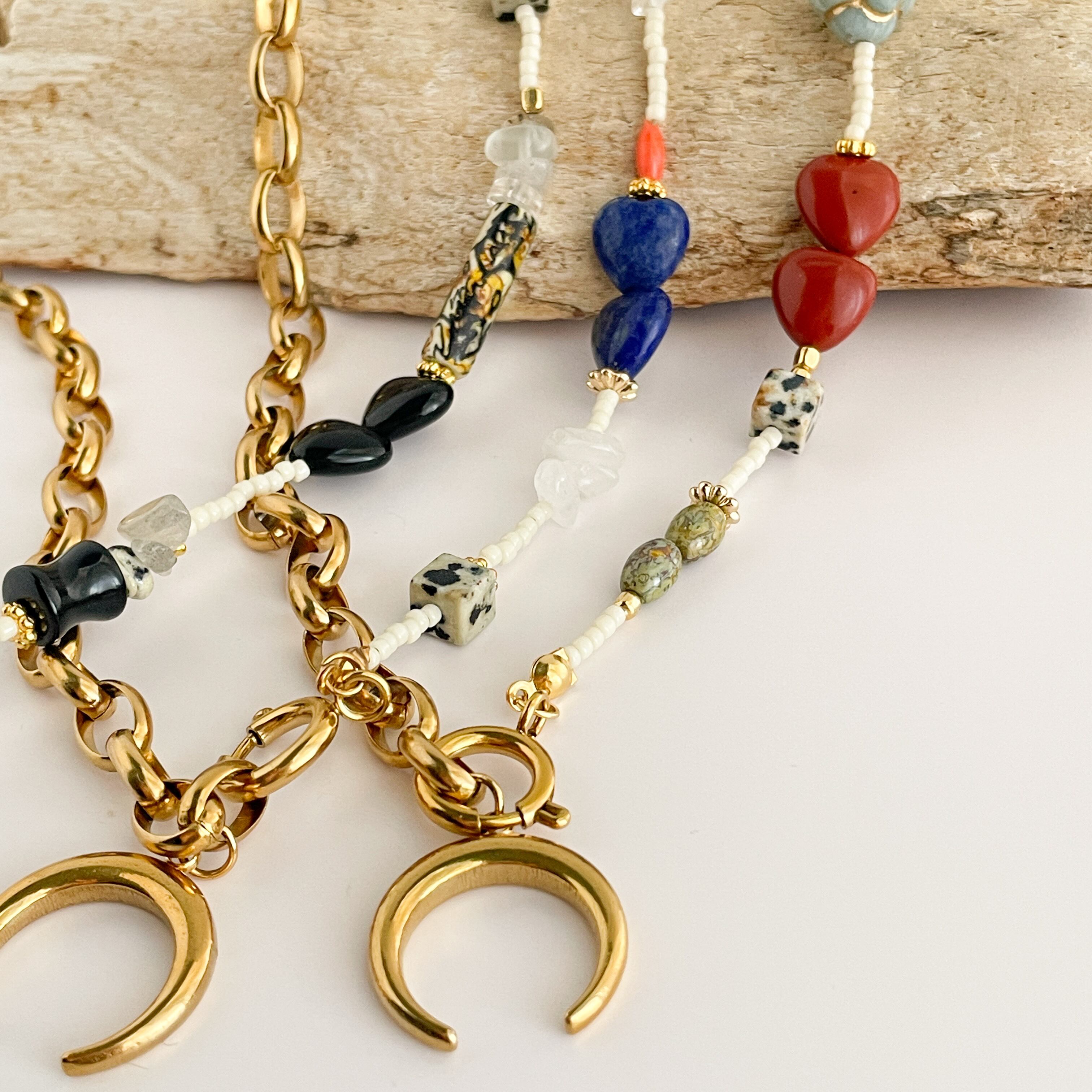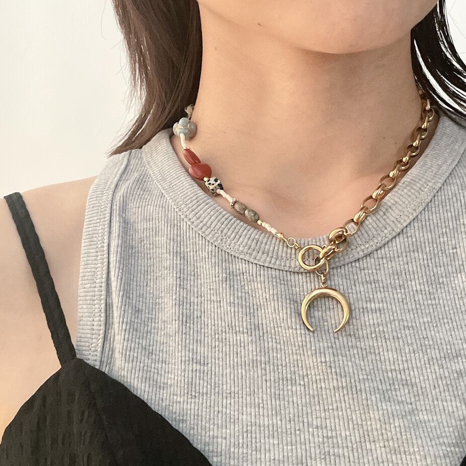 ゴールドカラーのサージカルステンレスチェーンに、色と表情が異なる天然石を繋いだ、温かみと個性を兼ね備えたネックレス。