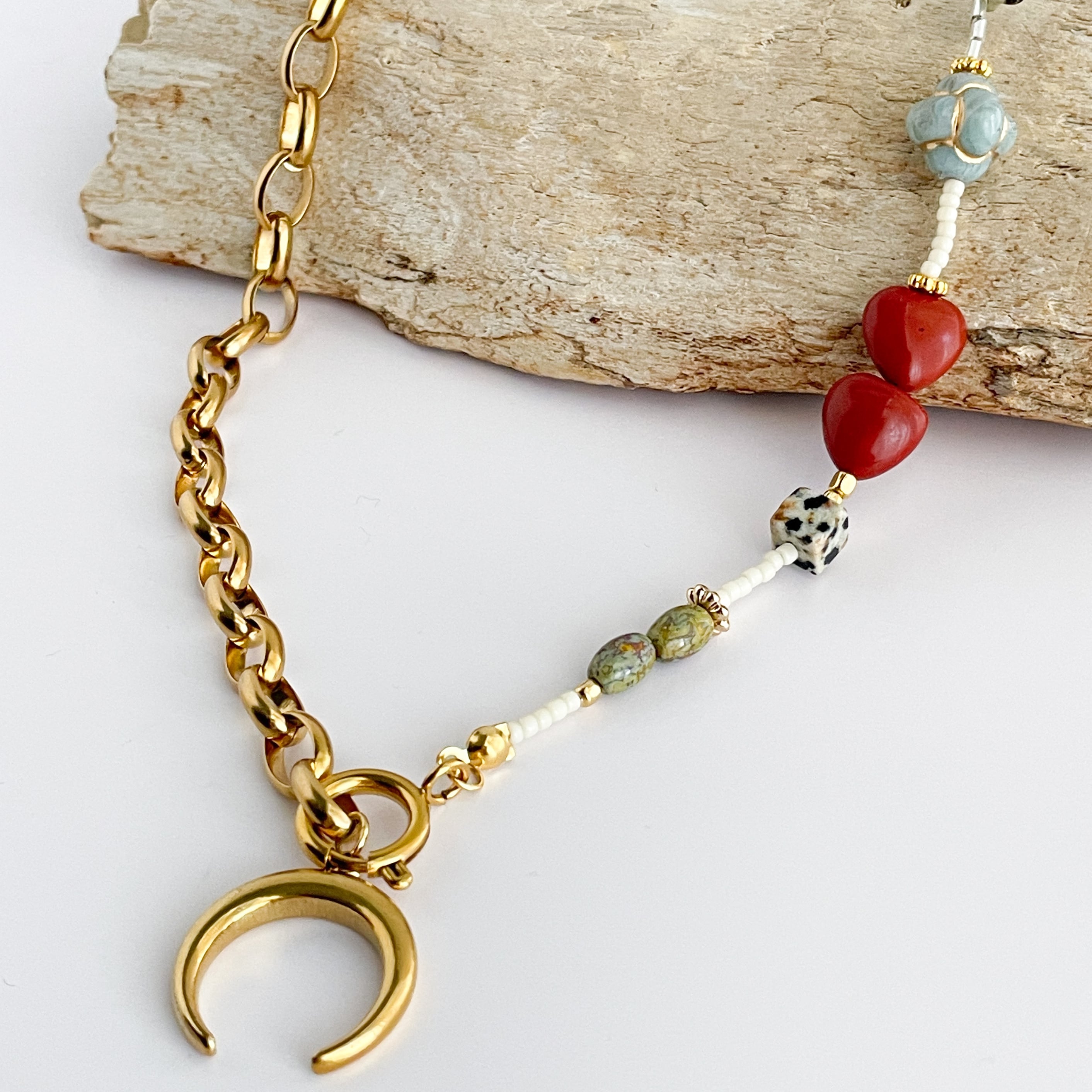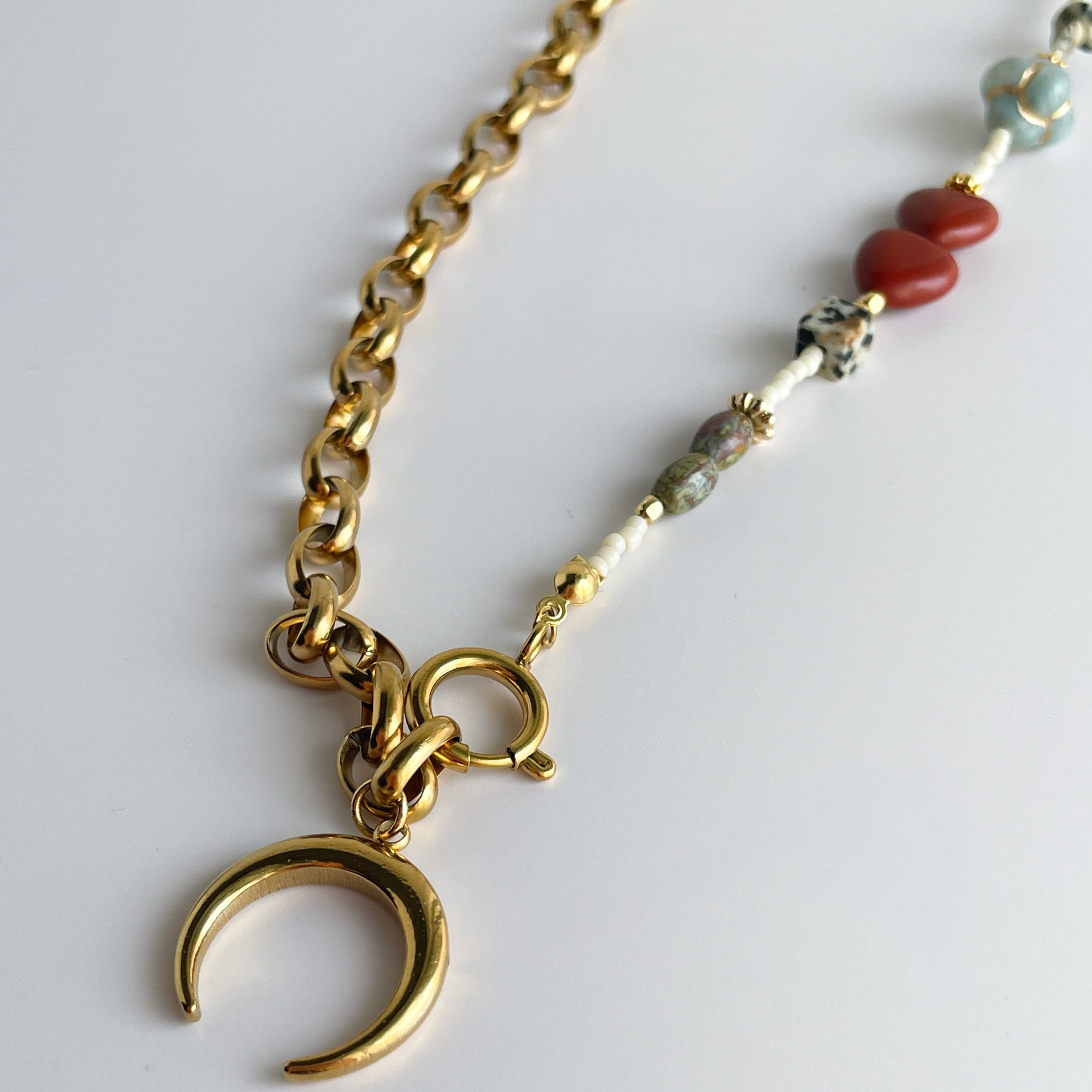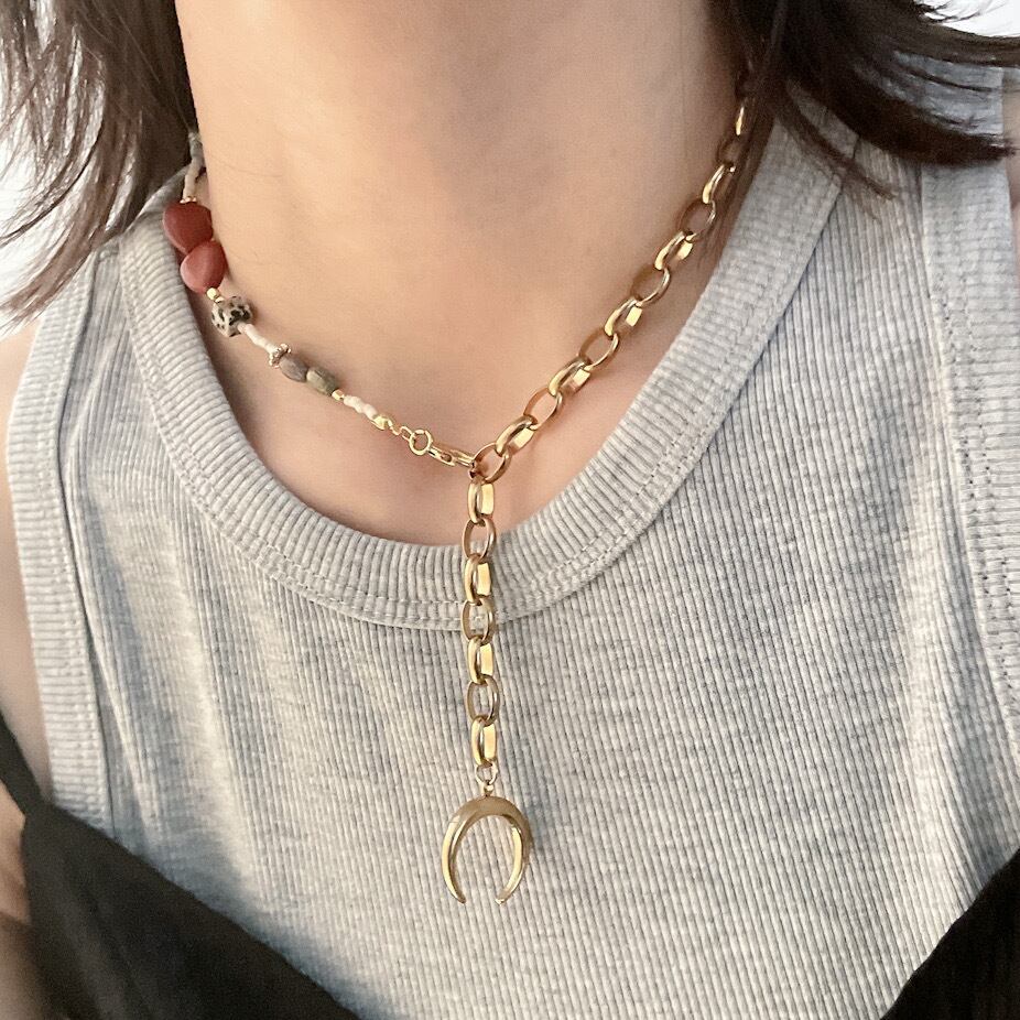 首元で静かに揺れる月のチャームの下には、落ち着いた赤茶色が美しいハート型のレッドジャスパー。