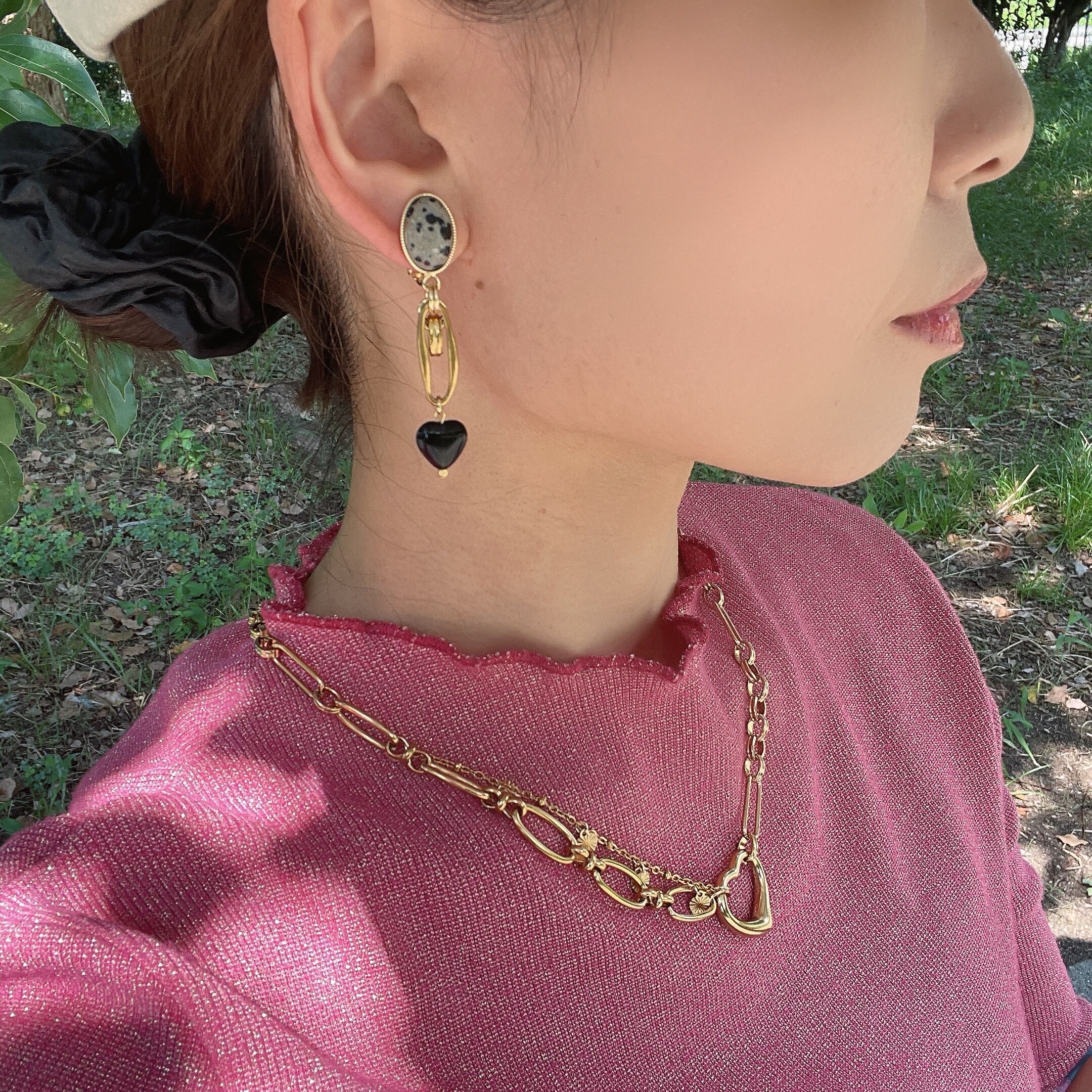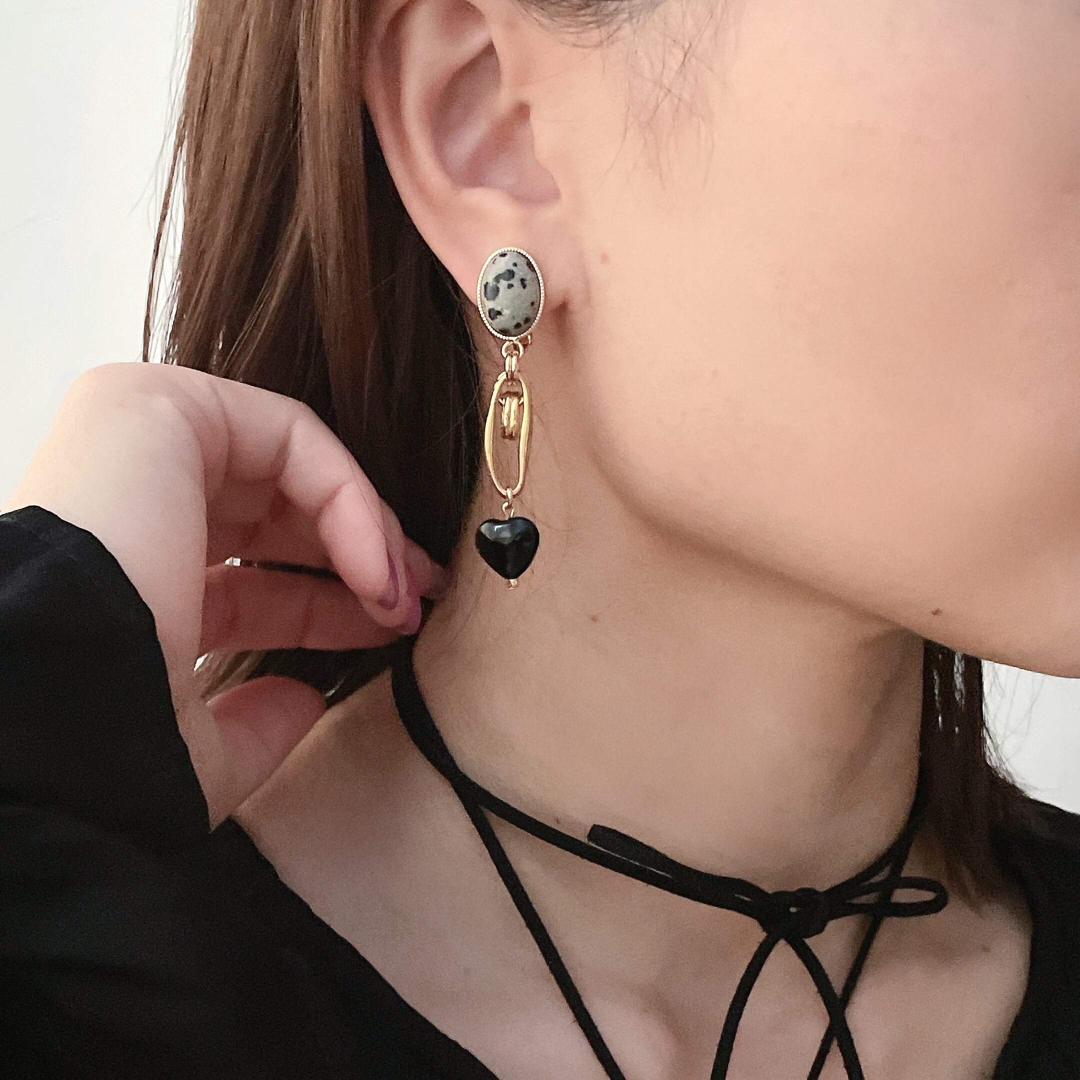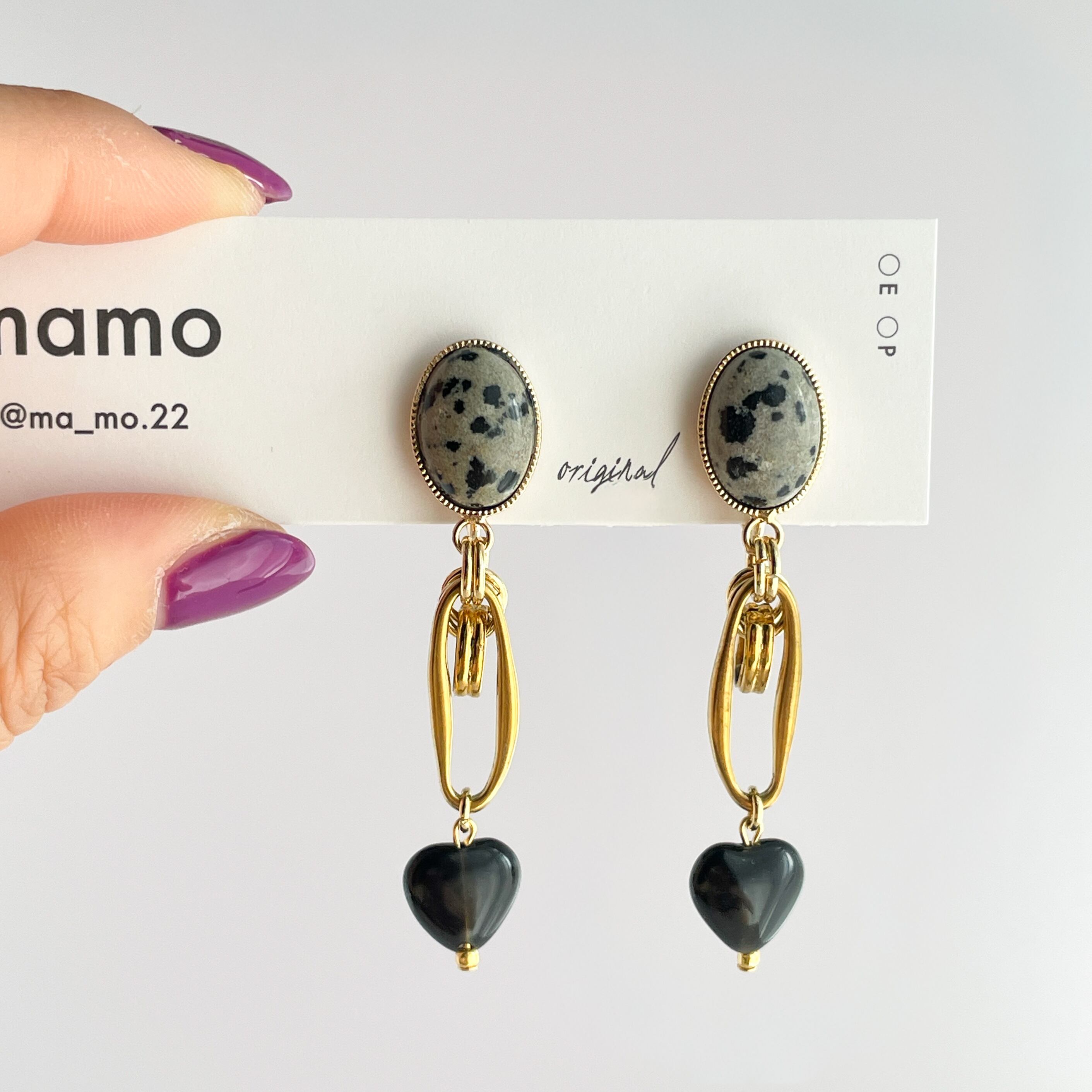 艶やかに黒く輝くオニキスのハートビーズを合わせた、シックで洗練された大人の耳飾り。