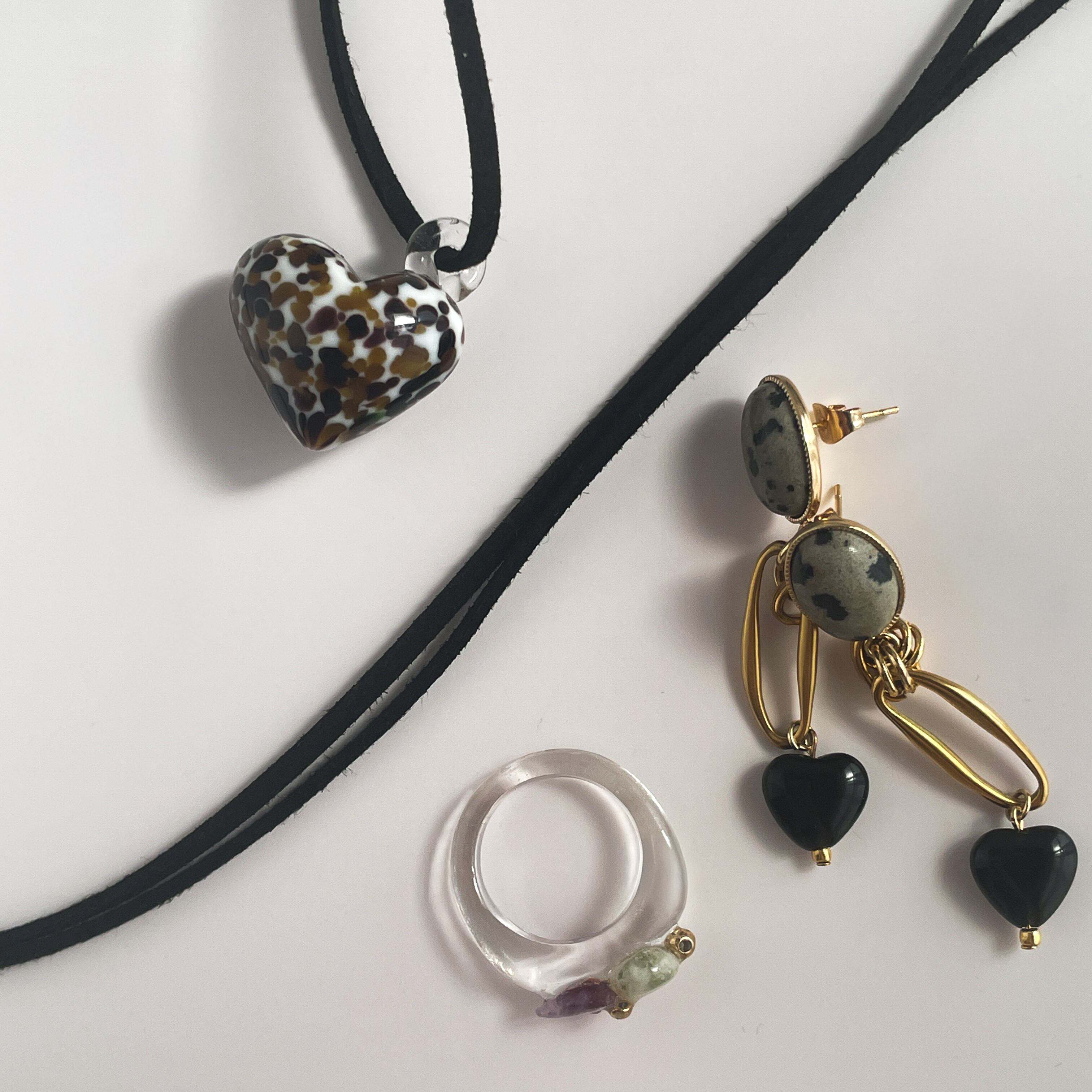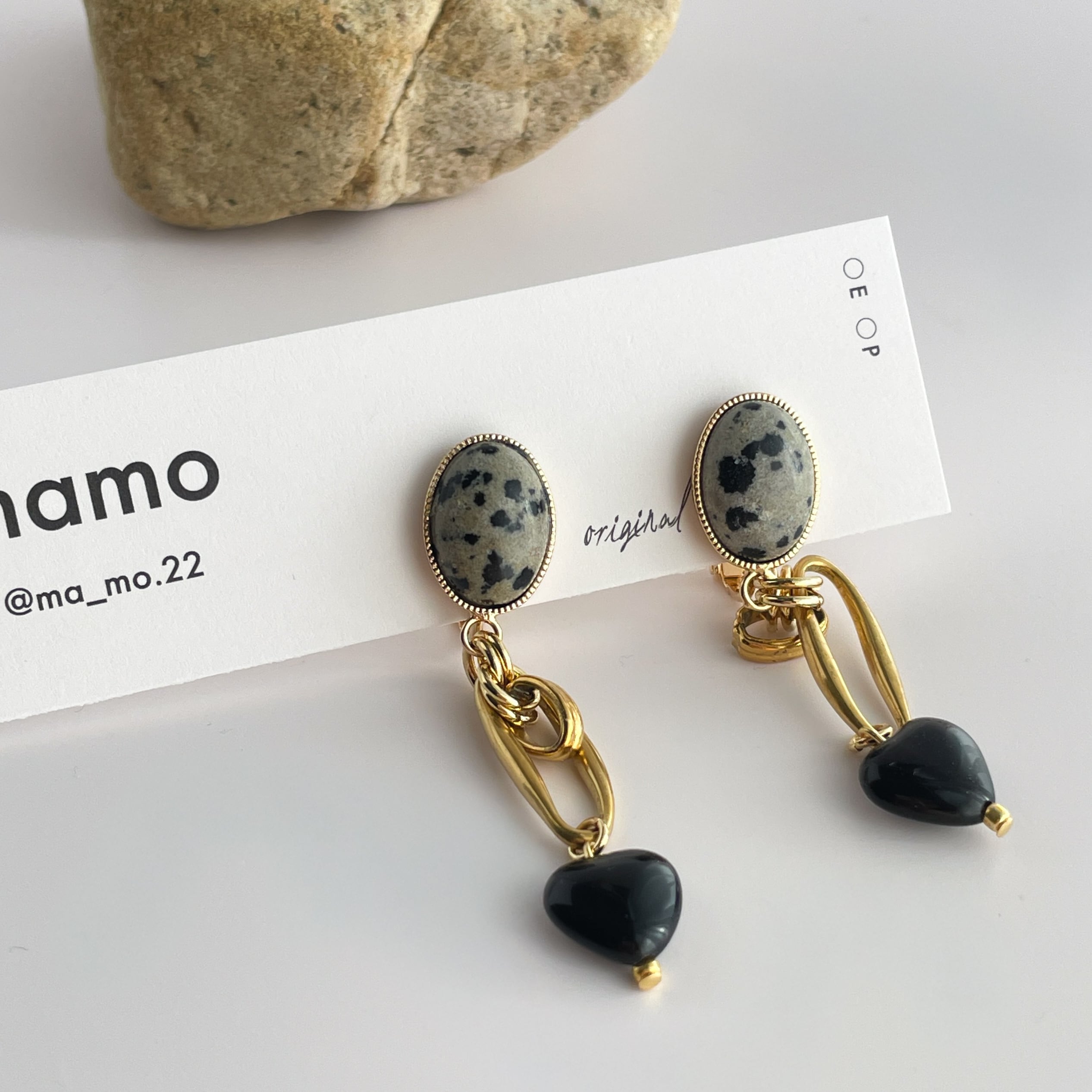 ダルメシアンジャスパーとオニキスの揺れるハートの耳飾り