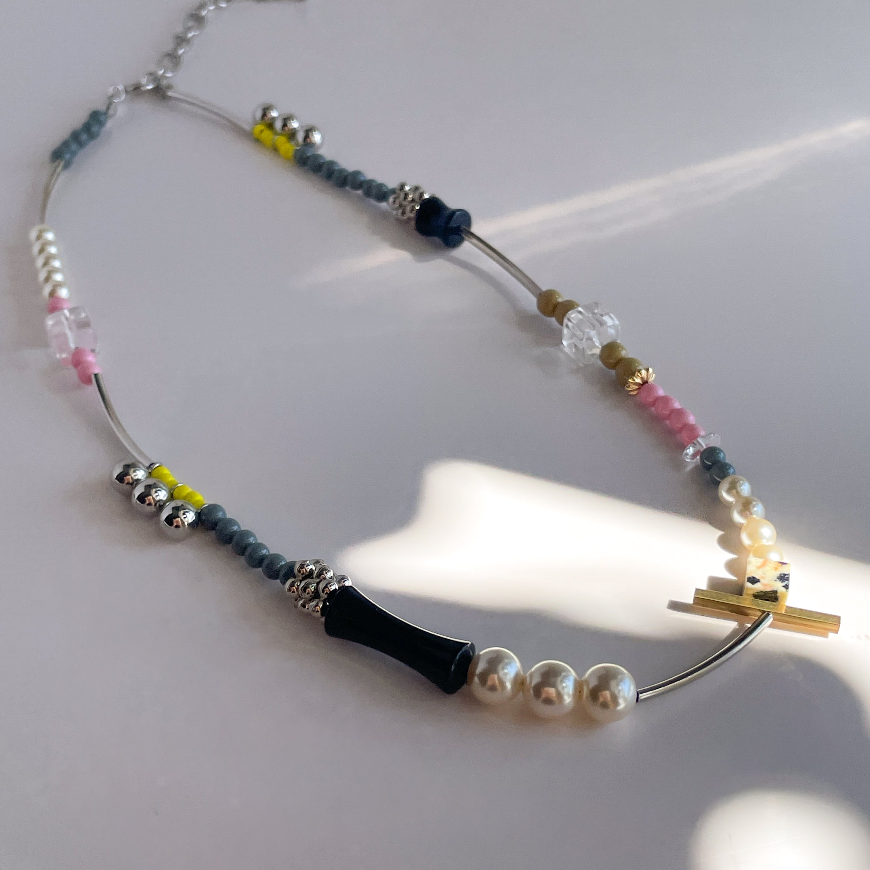 カラフルなビーズに、ヴィンテージパーツをミックスしたネックレス。