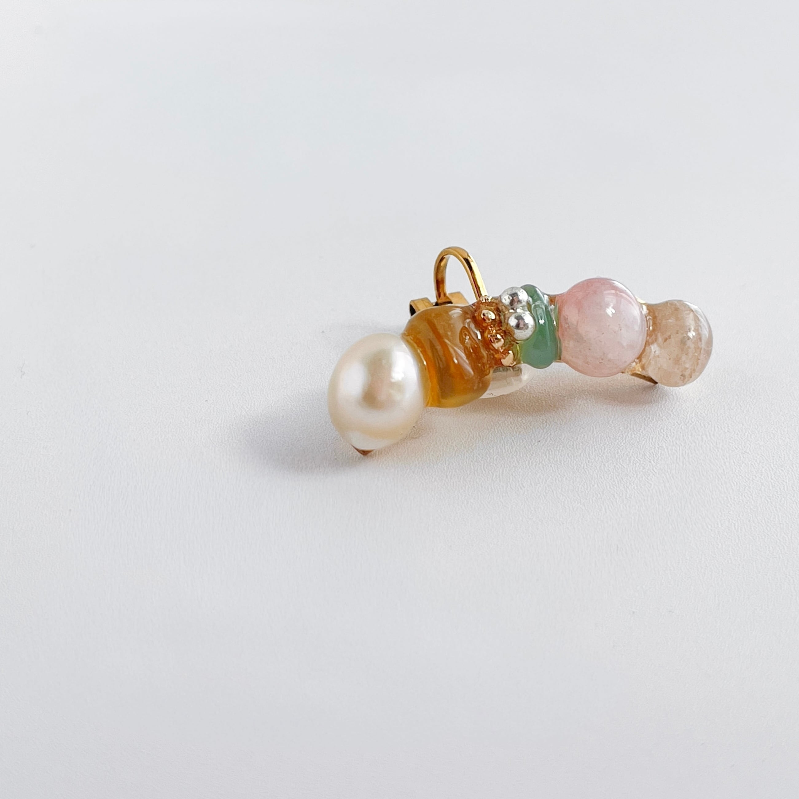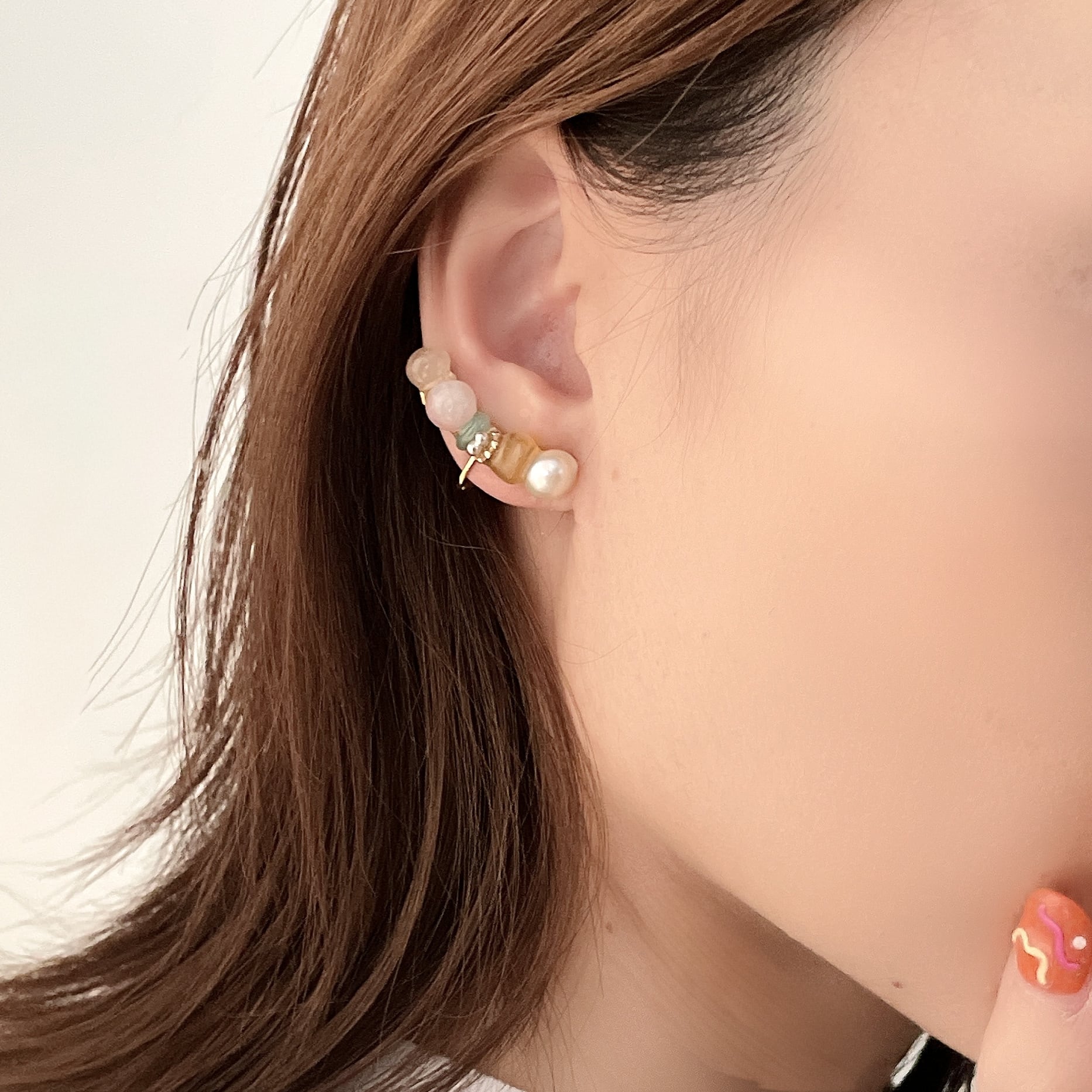 ひとつひとつ表情がちがう淡水パールと、個性豊かな天然石を組み合わせた、カラフルなイヤークリップです。