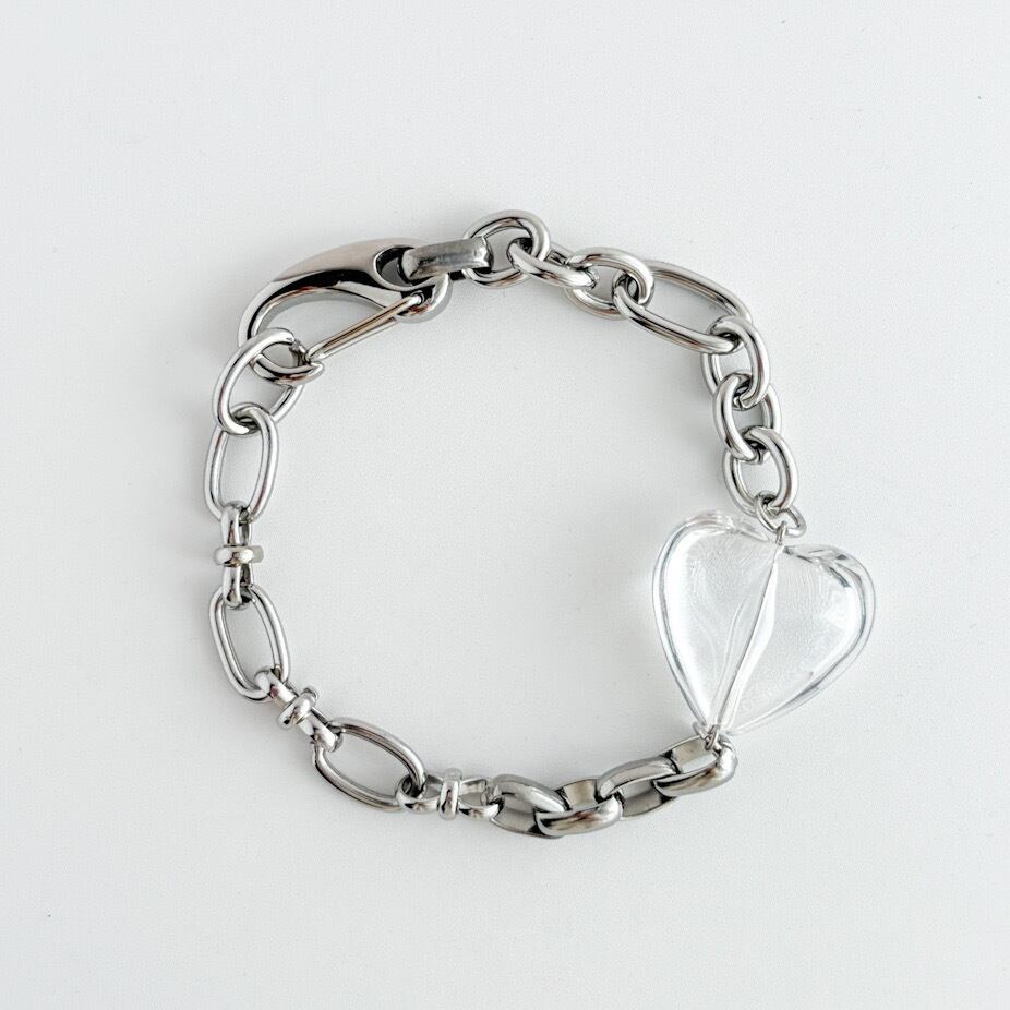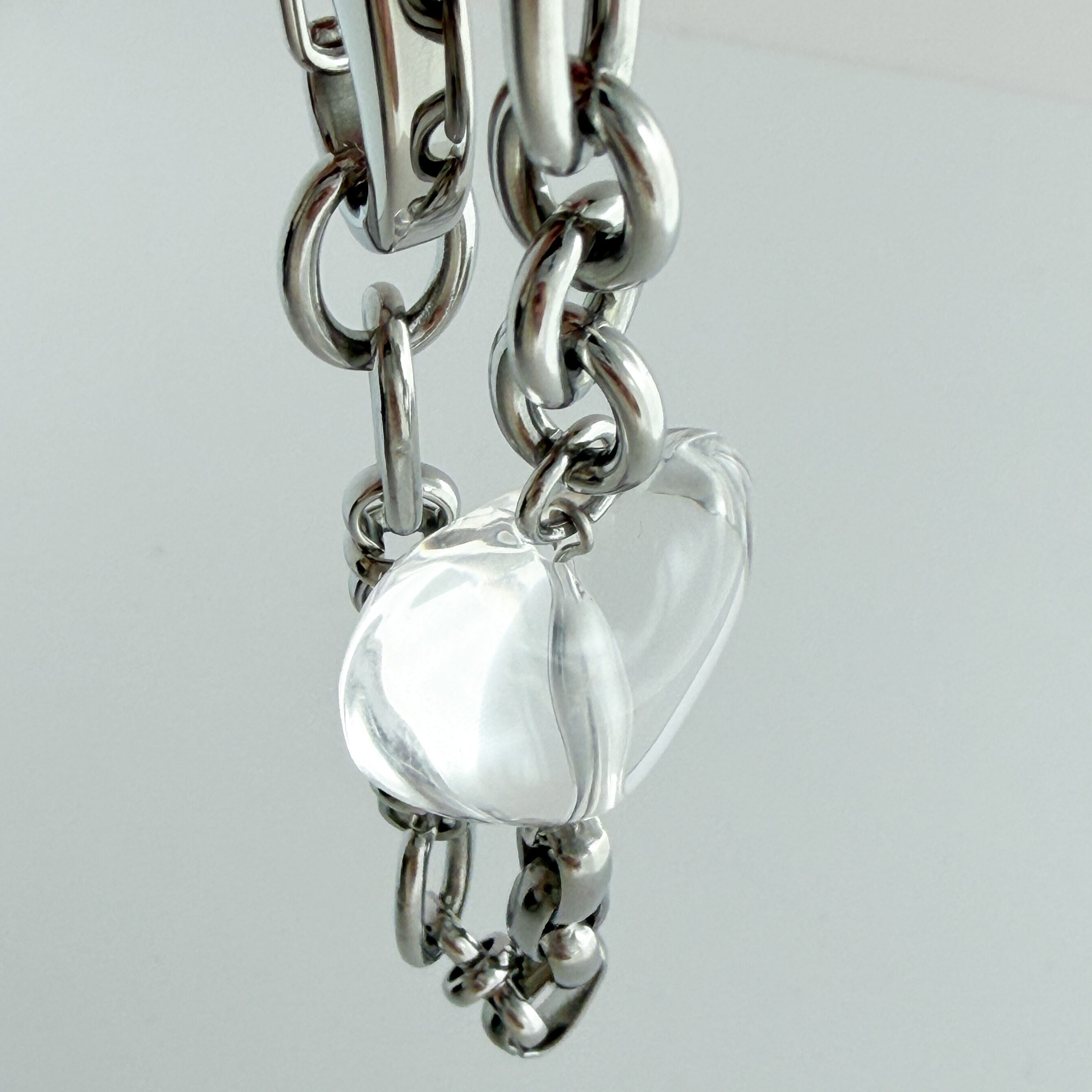 落ち着いたコーデに馴染むモノトーンパーツとクールなシルバーチェーンに加えて、今回のポイントはなんと言ってもクリアでぷっくり大きめのハートモチーフ。