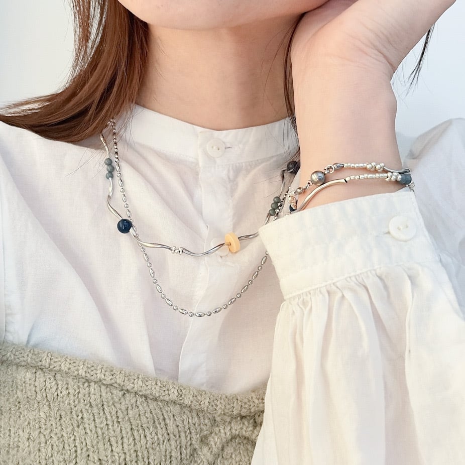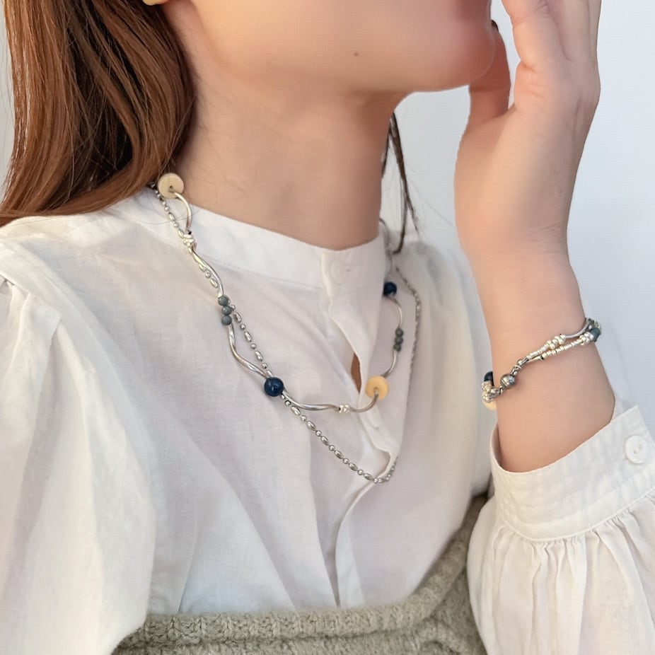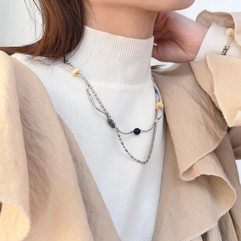 動きのあるシルバーパーツと、レトロな色味のヴィンテージパーツを組み合わせた2連ネックレスです。流れるような曲線が首元に華やかさをプラスし、角度によって異なる表情を楽しむことができます。