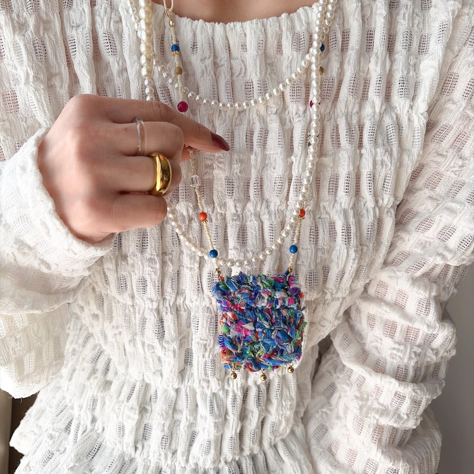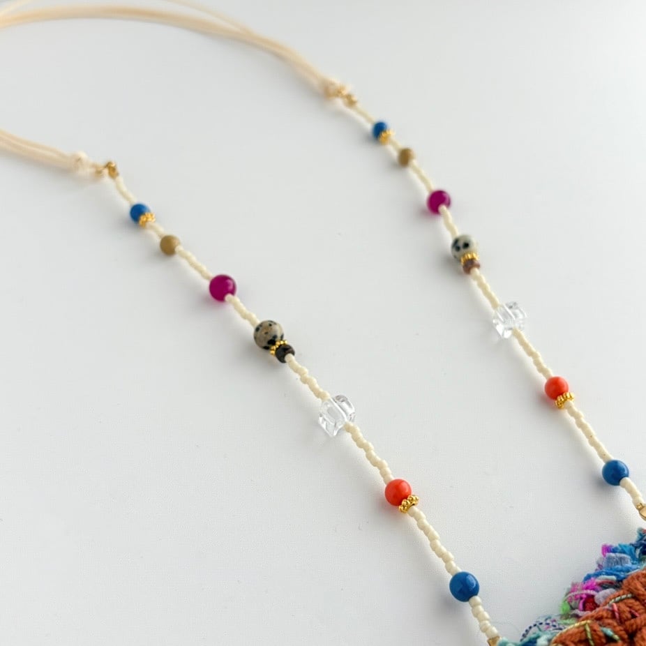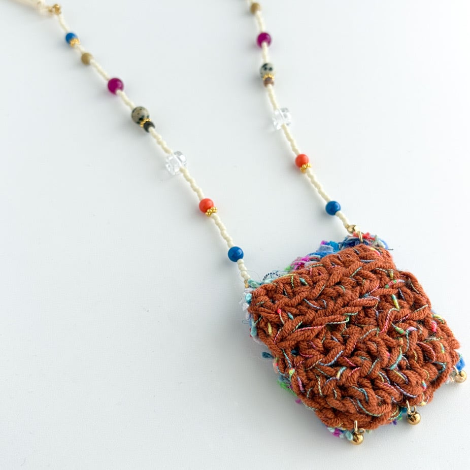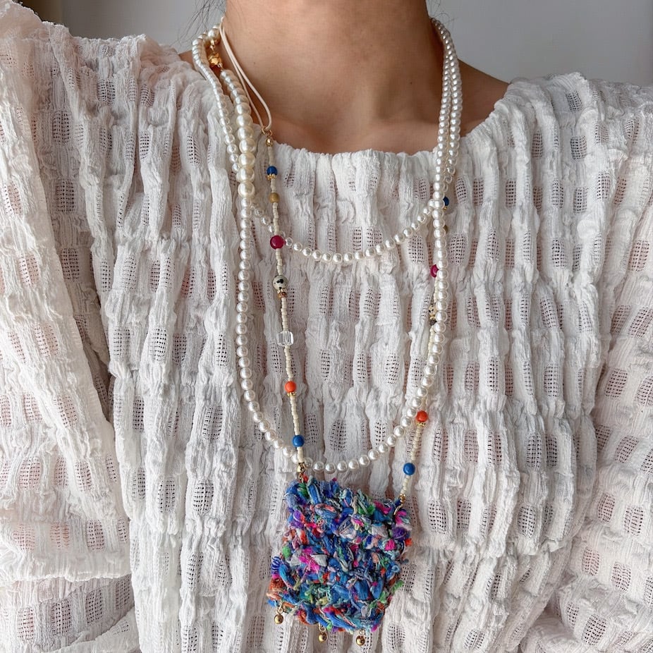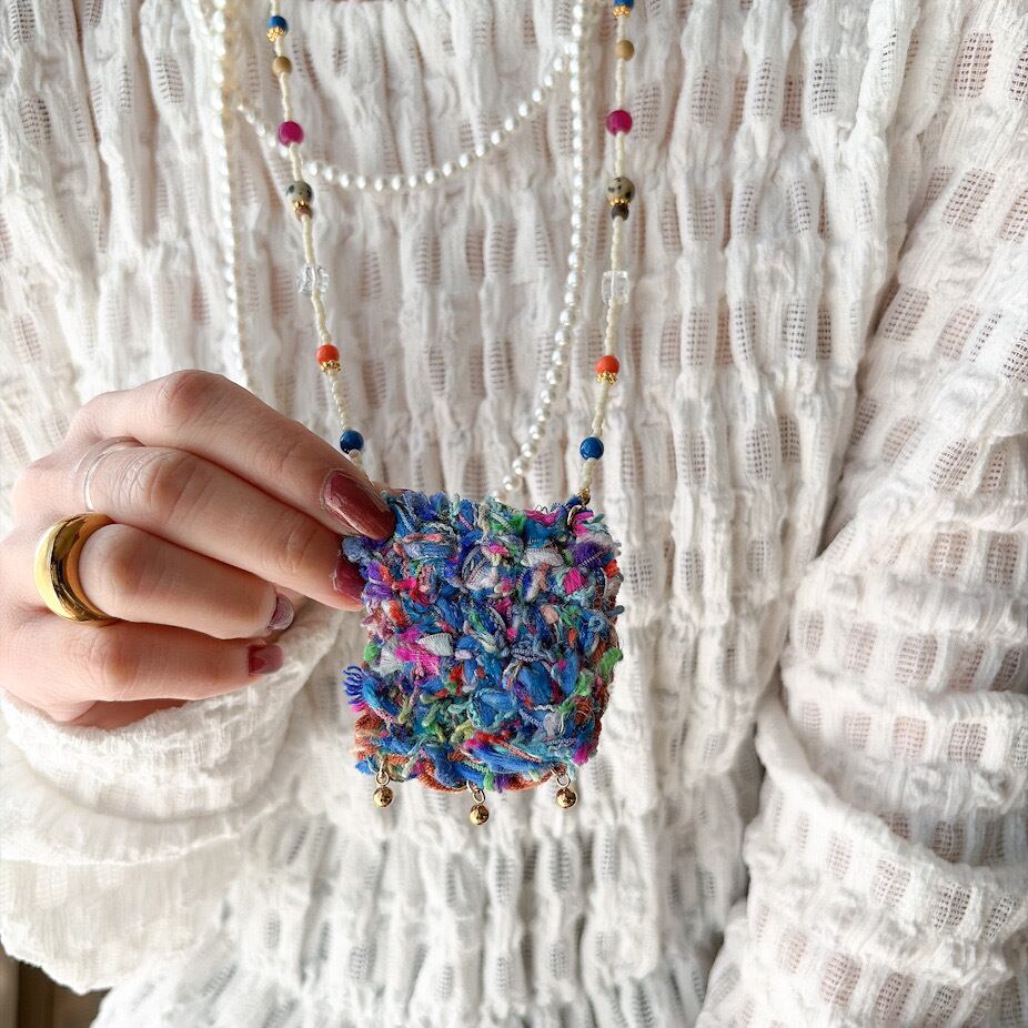 やわらかな糸で丁寧に編まれたポケットを、mamoらしいカラフルなビーズとコードでつなぎ、