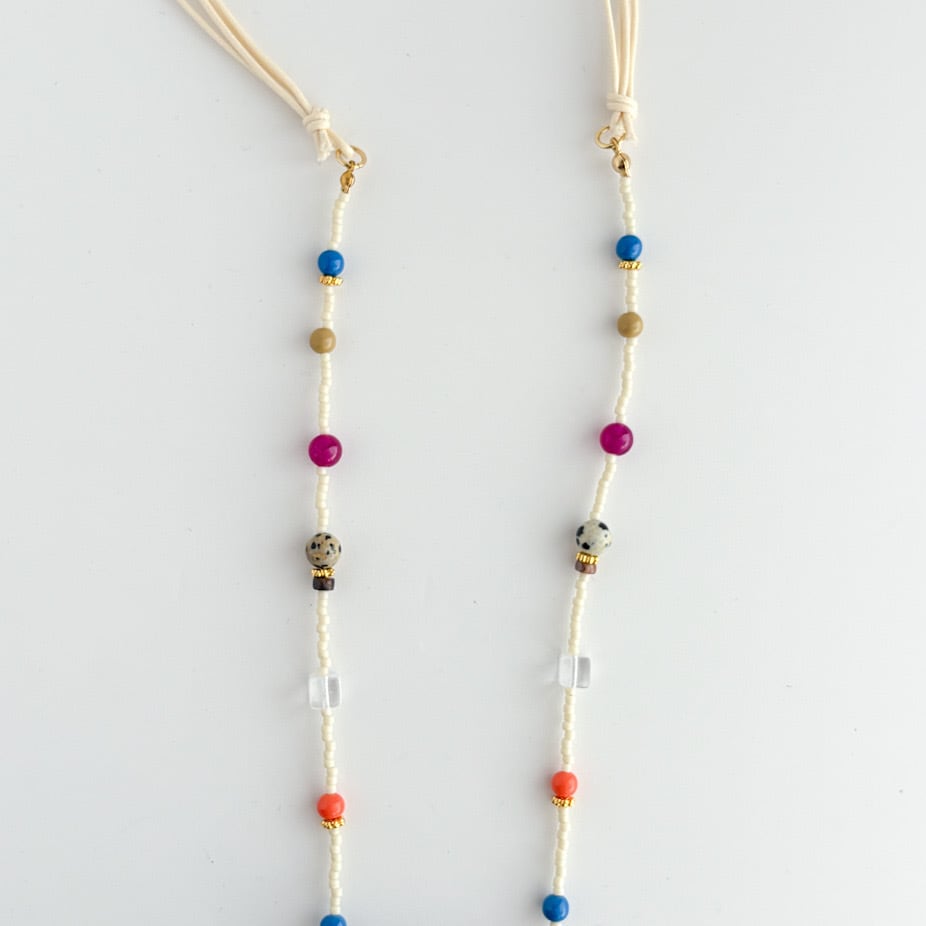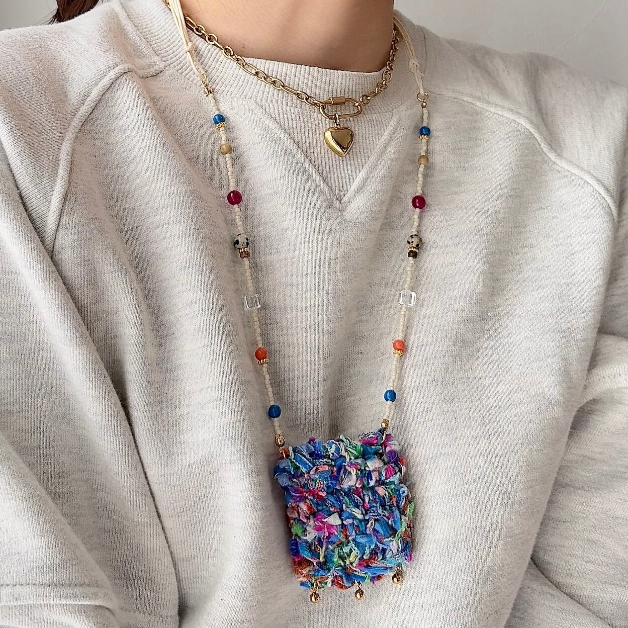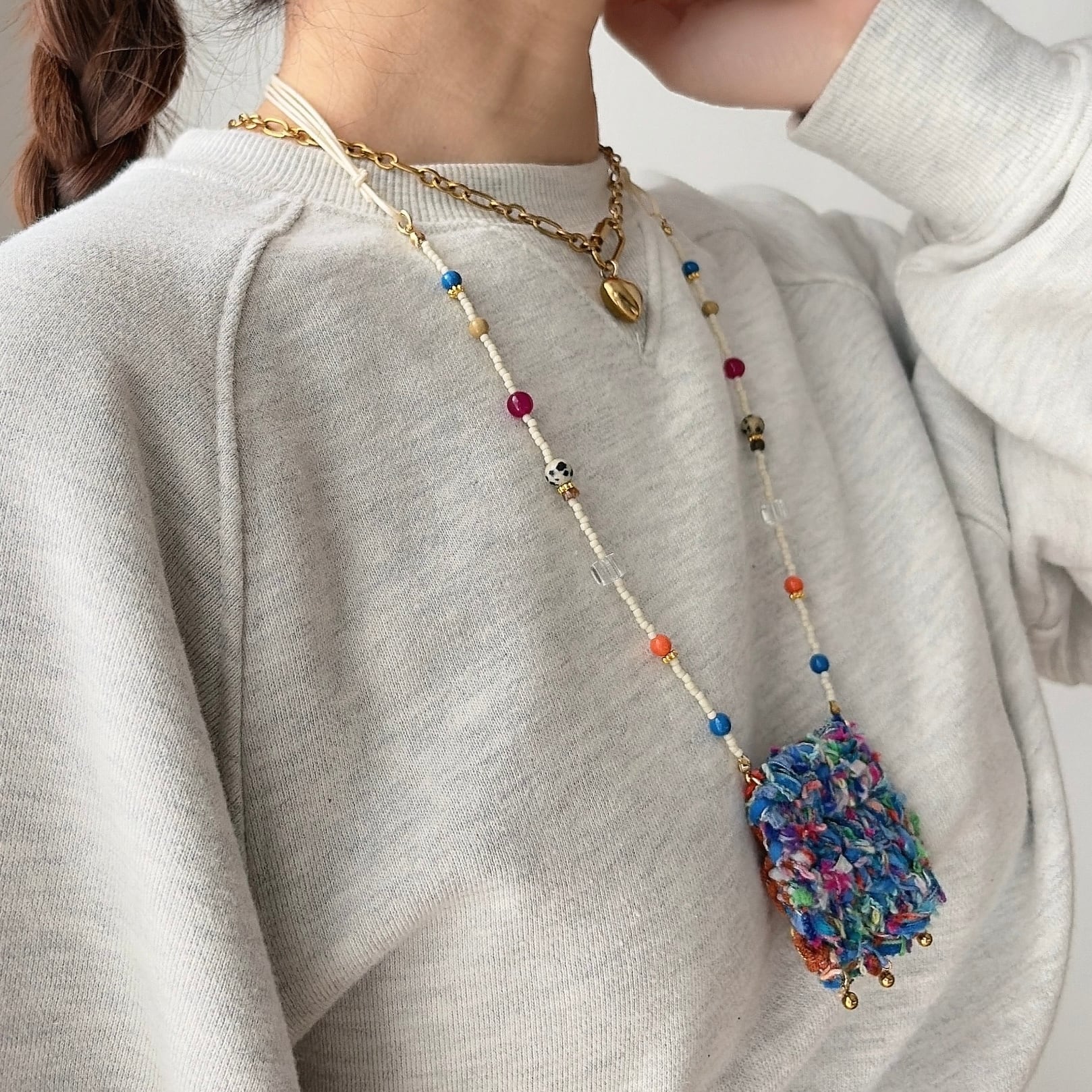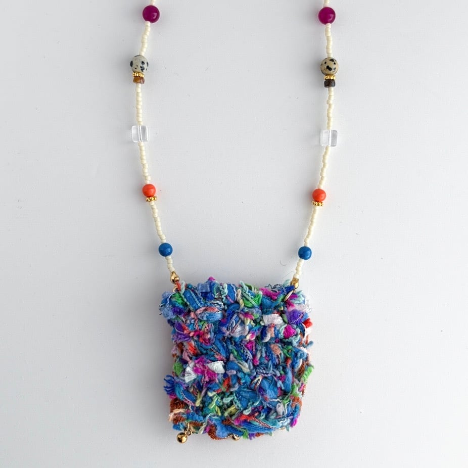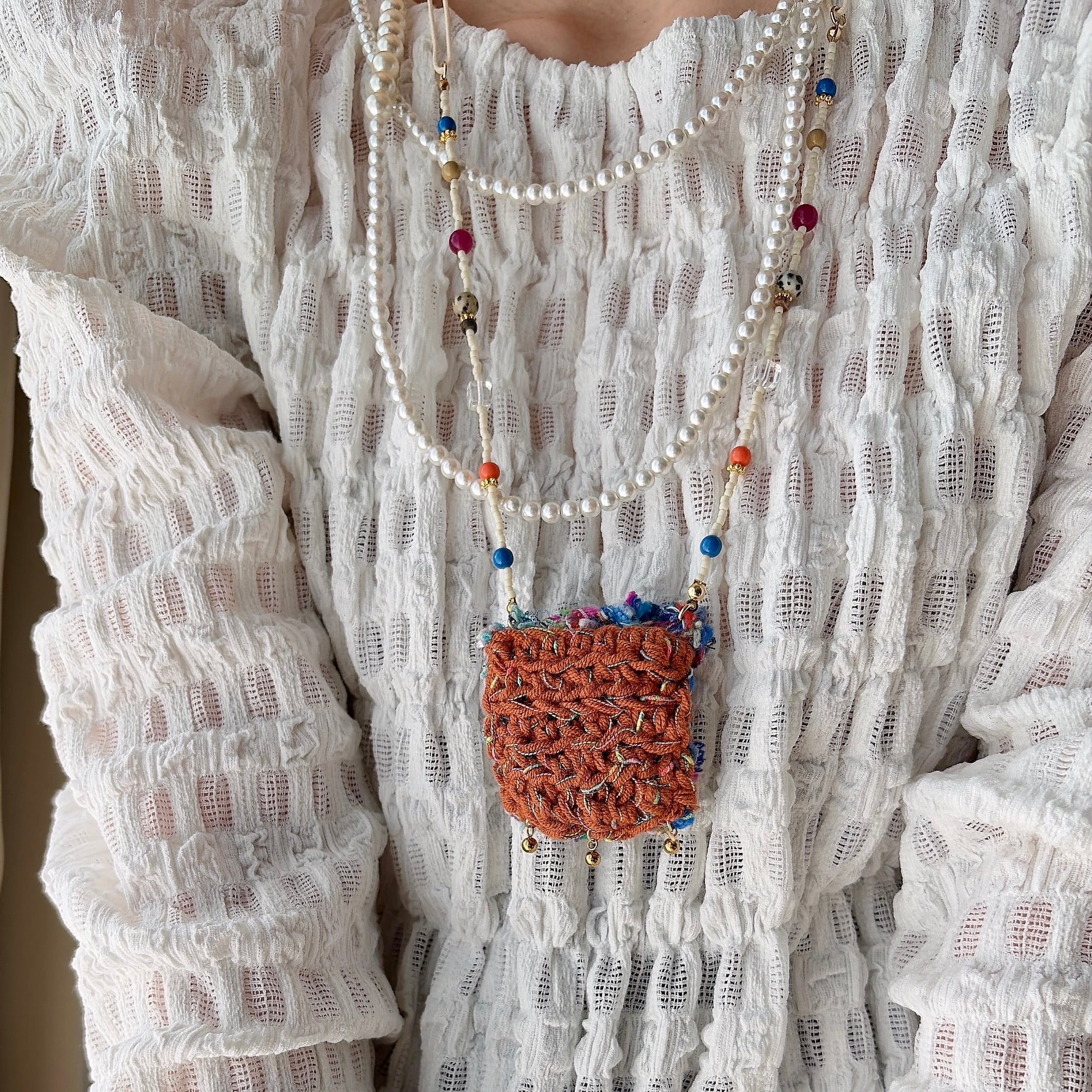 やわらかな糸で丁寧に編まれたポケットを、mamoらしいカラフルなビーズとコードでつなぎ、