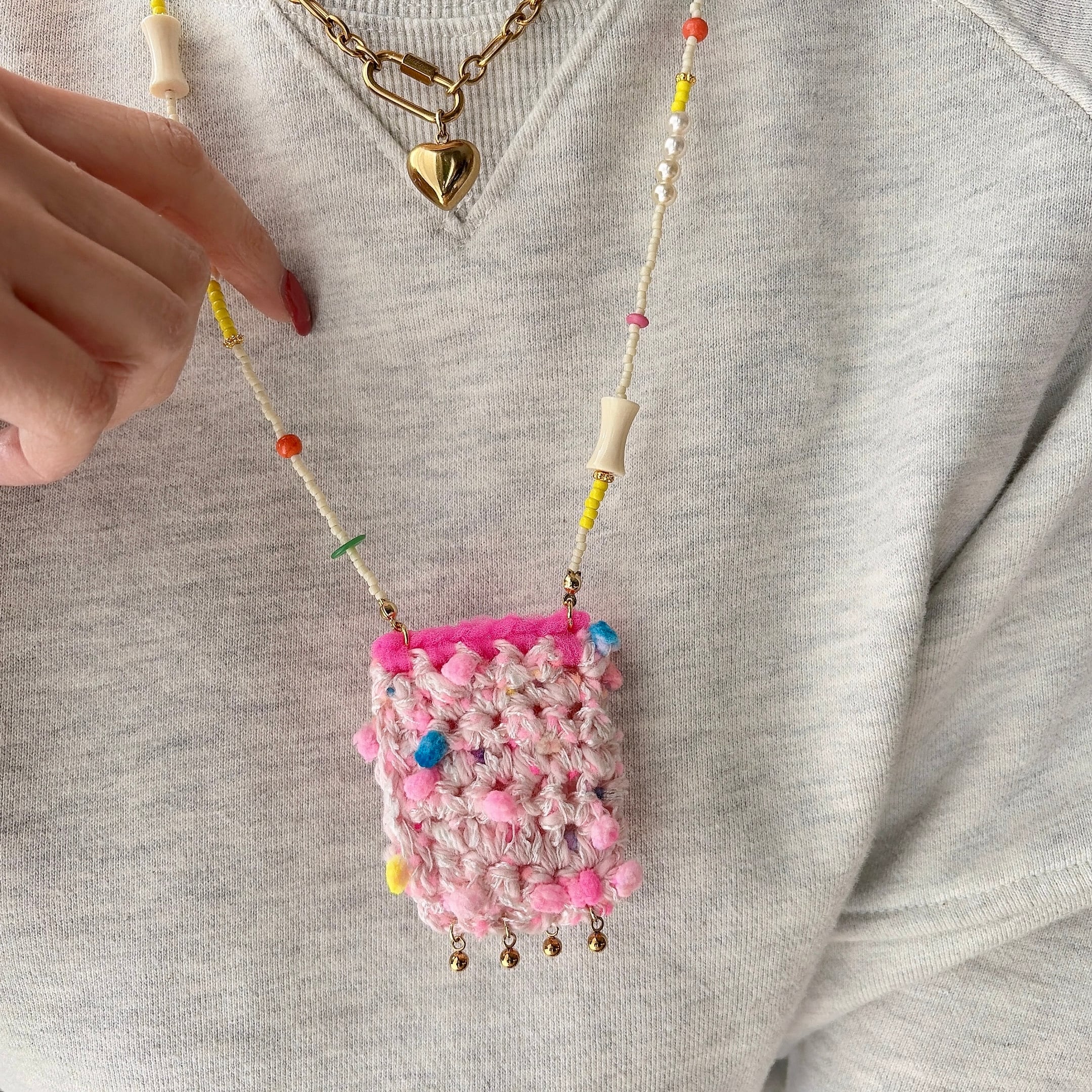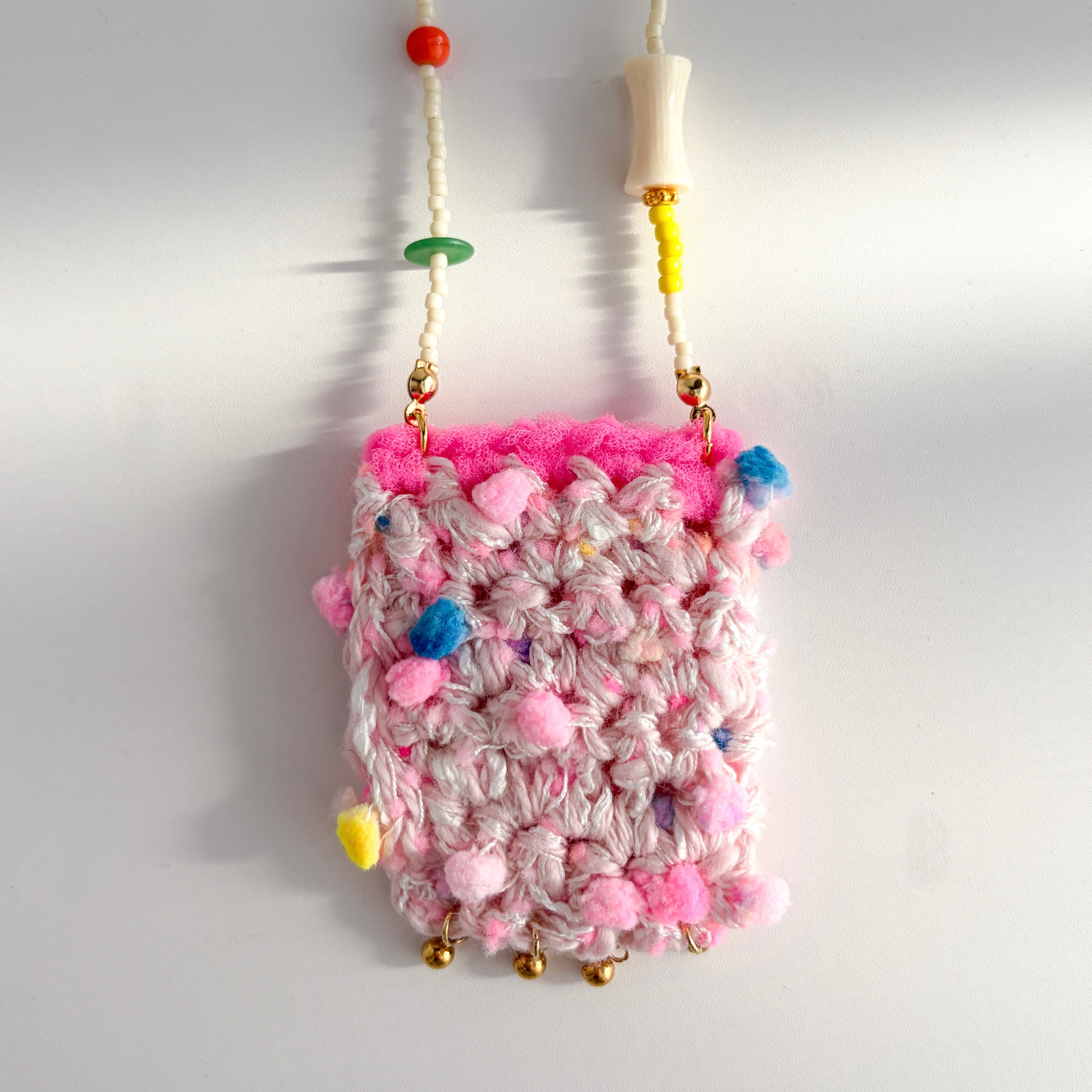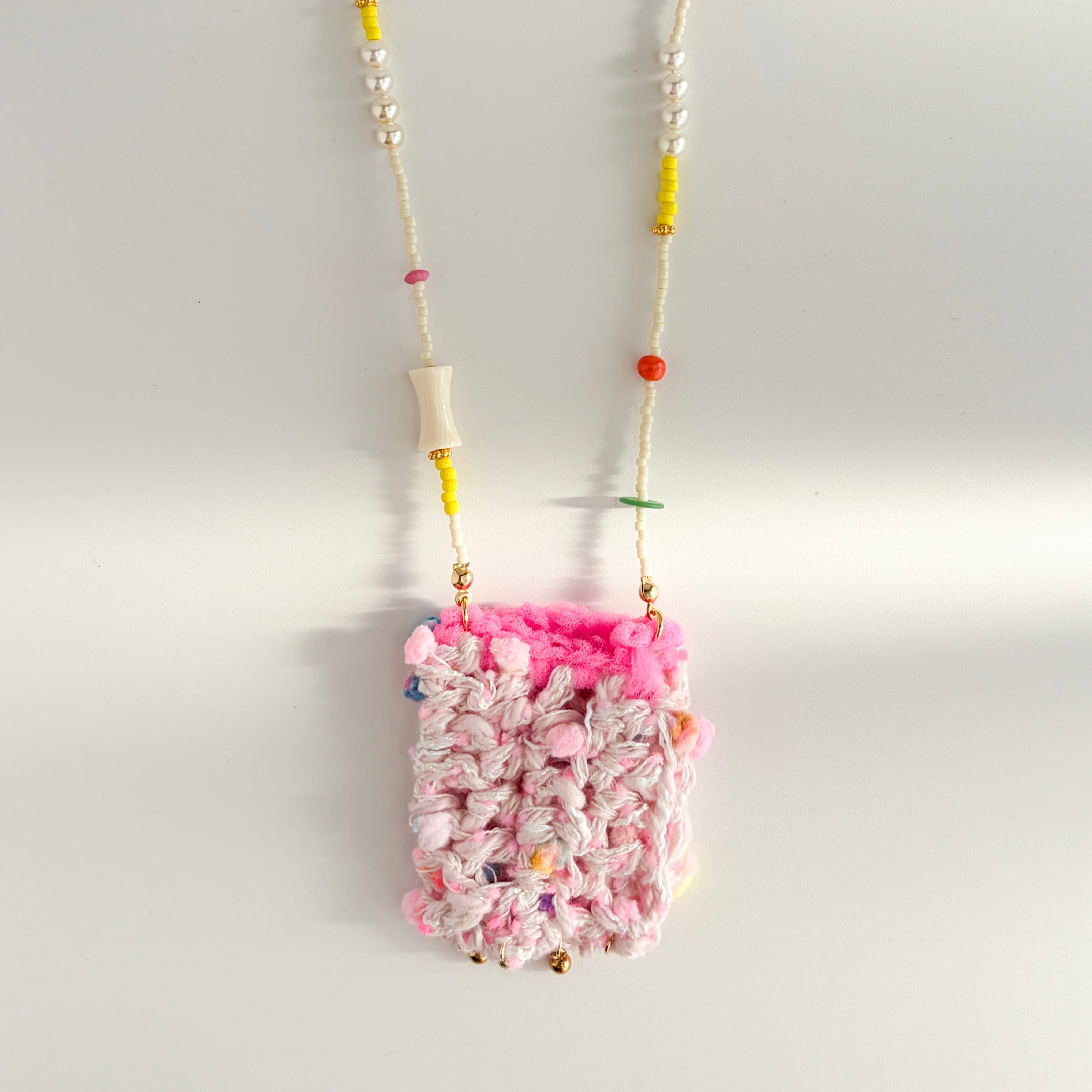 やわらかな糸で丁寧に編まれたポケットを、mamoらしいカラフルなビーズとコードでつなぎ、