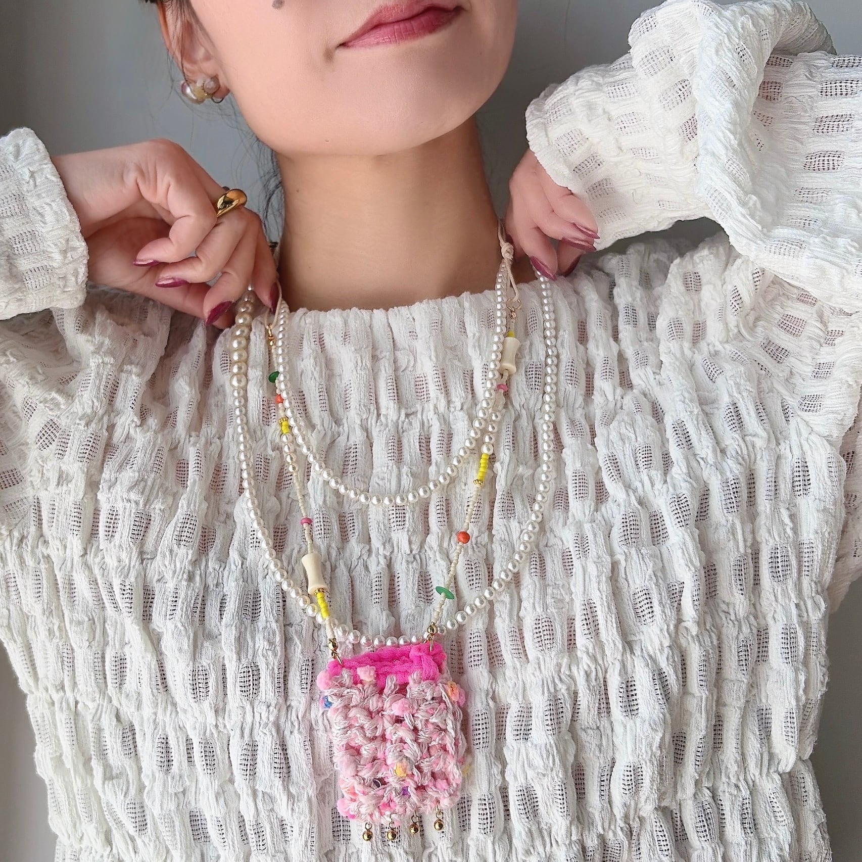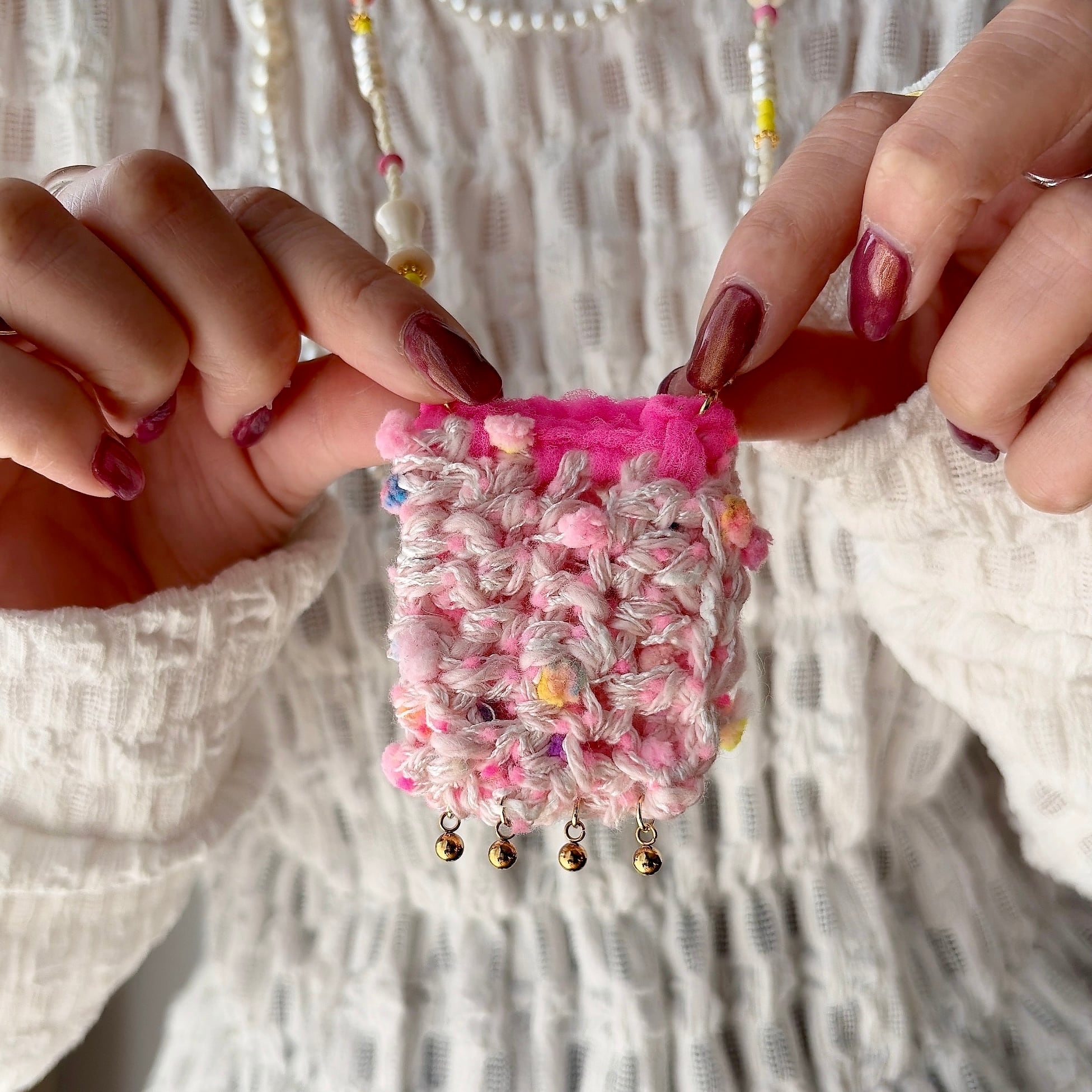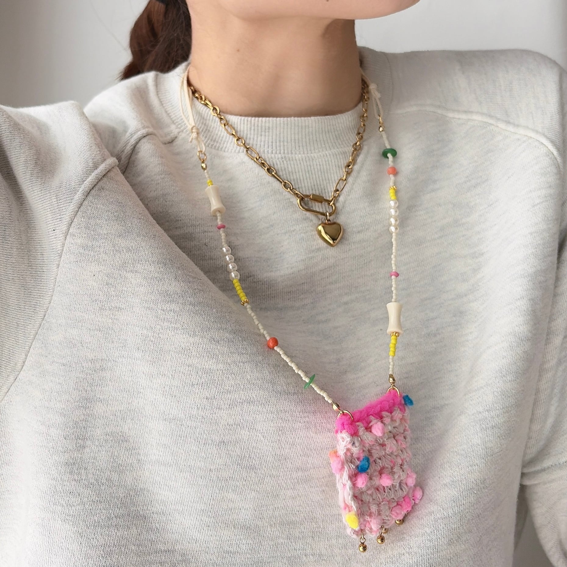 やわらかな糸で丁寧に編まれたポケットを、mamoらしいカラフルなビーズとコードでつなぎ、