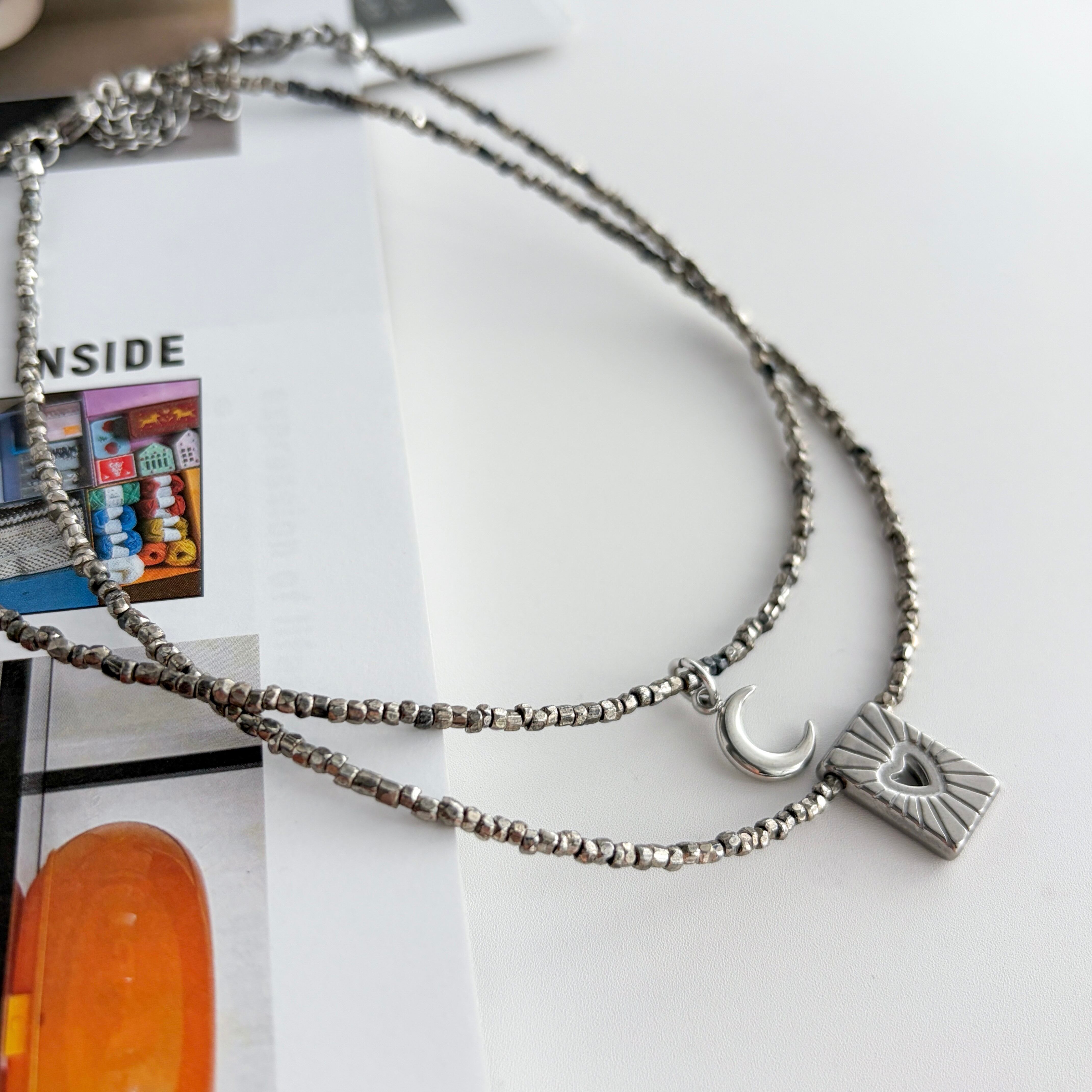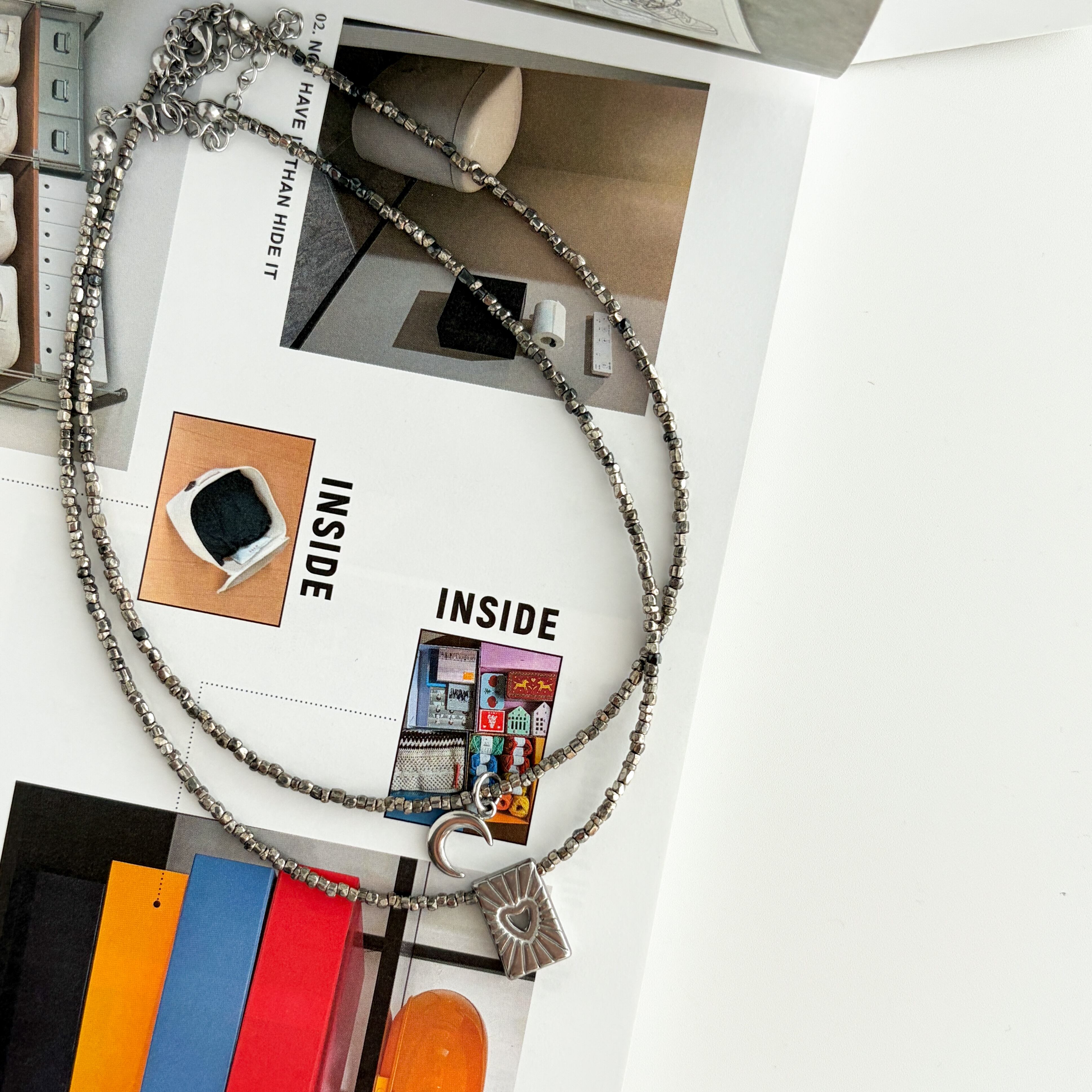 カラフルなネックレスとの重ね付けもお勧めで、首元に奥行きが生まれ、より印象的なスタイルに。